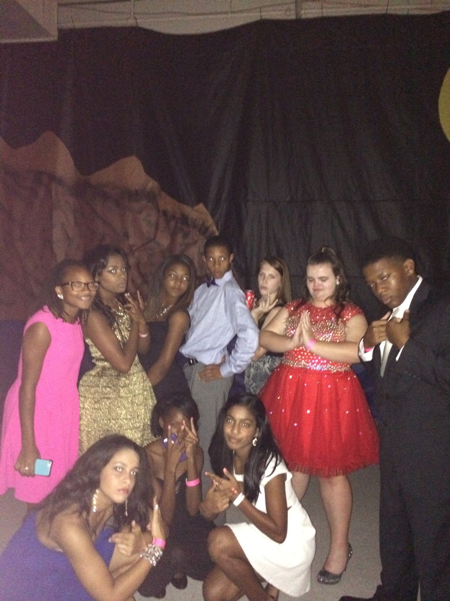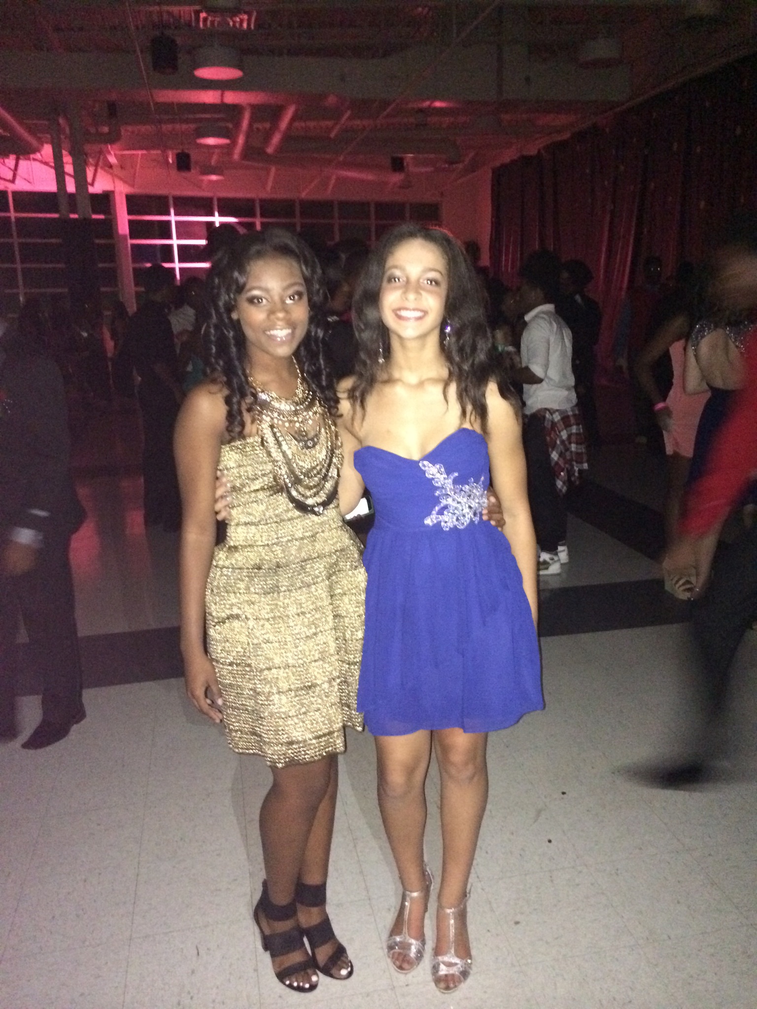 IMG_3847-0.JPGI went to my first High School Homecoming last night. I’m wearing a gold dress from Mix 5 a boutique in Atlanta, a gold layered necklace, and black Steve Madden Heels. My makeup was done by my Mother and hair by my cousin. Ciara is wearing a royal blue dress with an embroidered side, silver heels, and long dangling earrings.