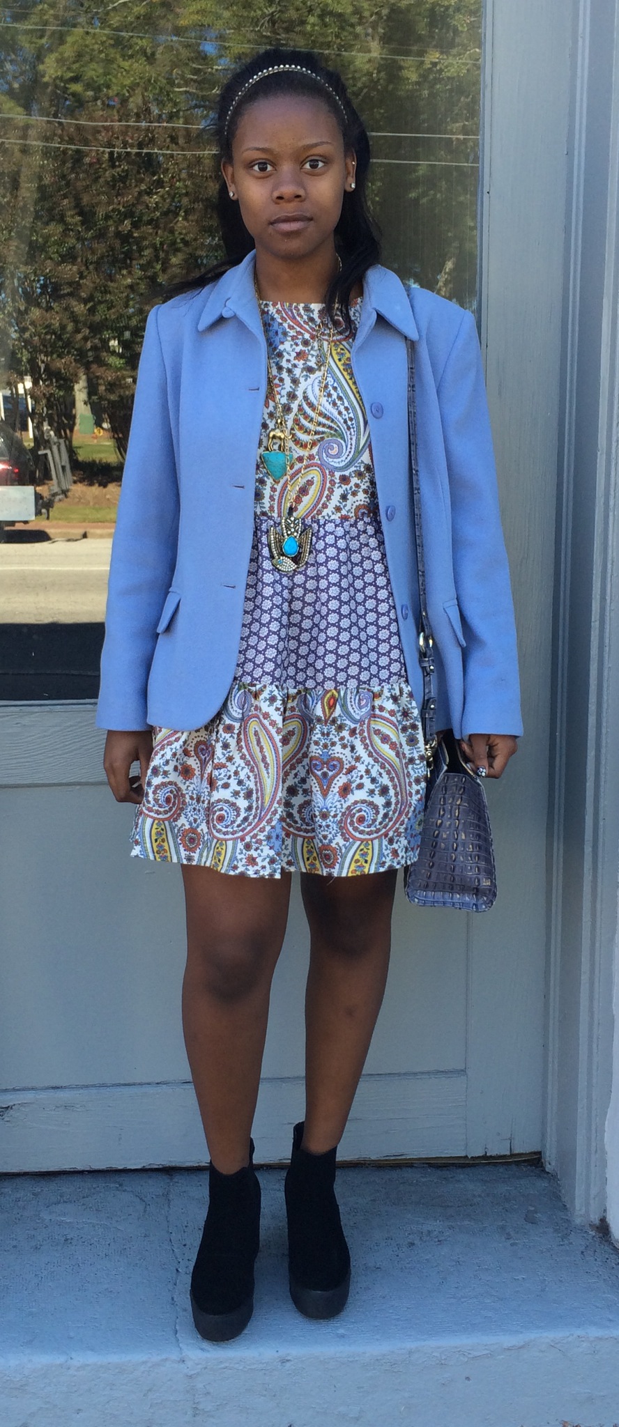 First off, I’m so sorry I haven’t blogged in weeks! I’ll work on posting more frequently. But, I’m wearing this bohemian styled dress from Ross! The blue blazer was thrifted from a local thrift store. It’s really comfy and feels very “Zooey Deschanel”. I paired the outfit with black platform booties, and added two long necklaces and bracelets. Never forget to accessorize it makes your outfit!