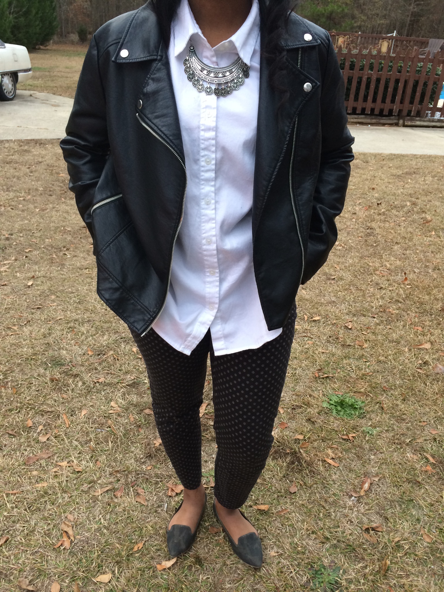 I’m in love with this outfit! It’s comfy, but looks very put together. The oversized white button down looks great with the printed pants, and the leather jacket gives it an edgier look.