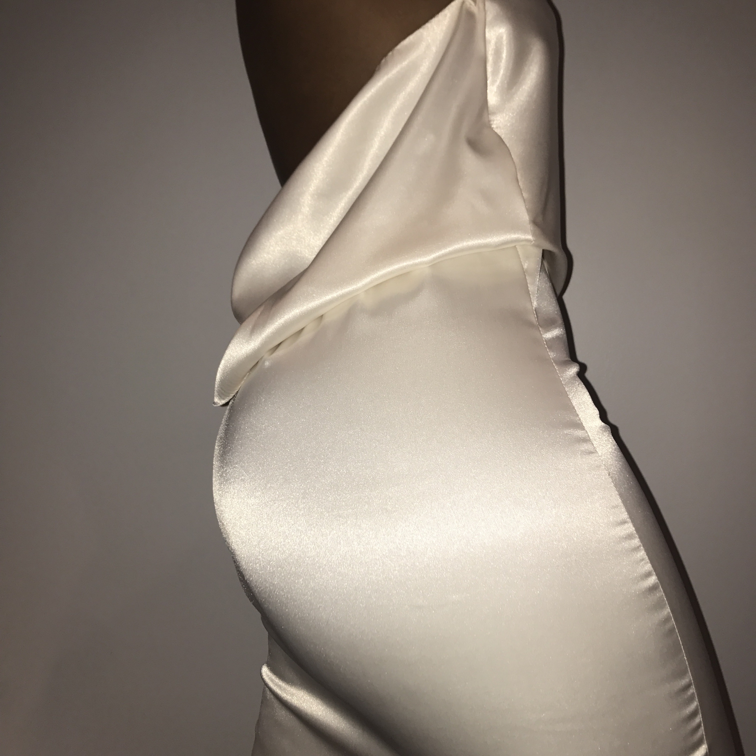 So I created a two piece Satin set in the shade eggnog. The top has an exposed back and dramatic drape. I am in love! For the bottom, I wanted something subtle, because my goal was for the sleeveless blouse to get all of the attention, so I opted for a simple yet elegant pencil skirt.