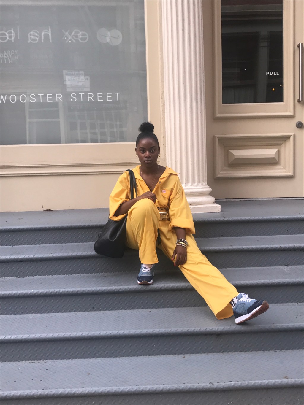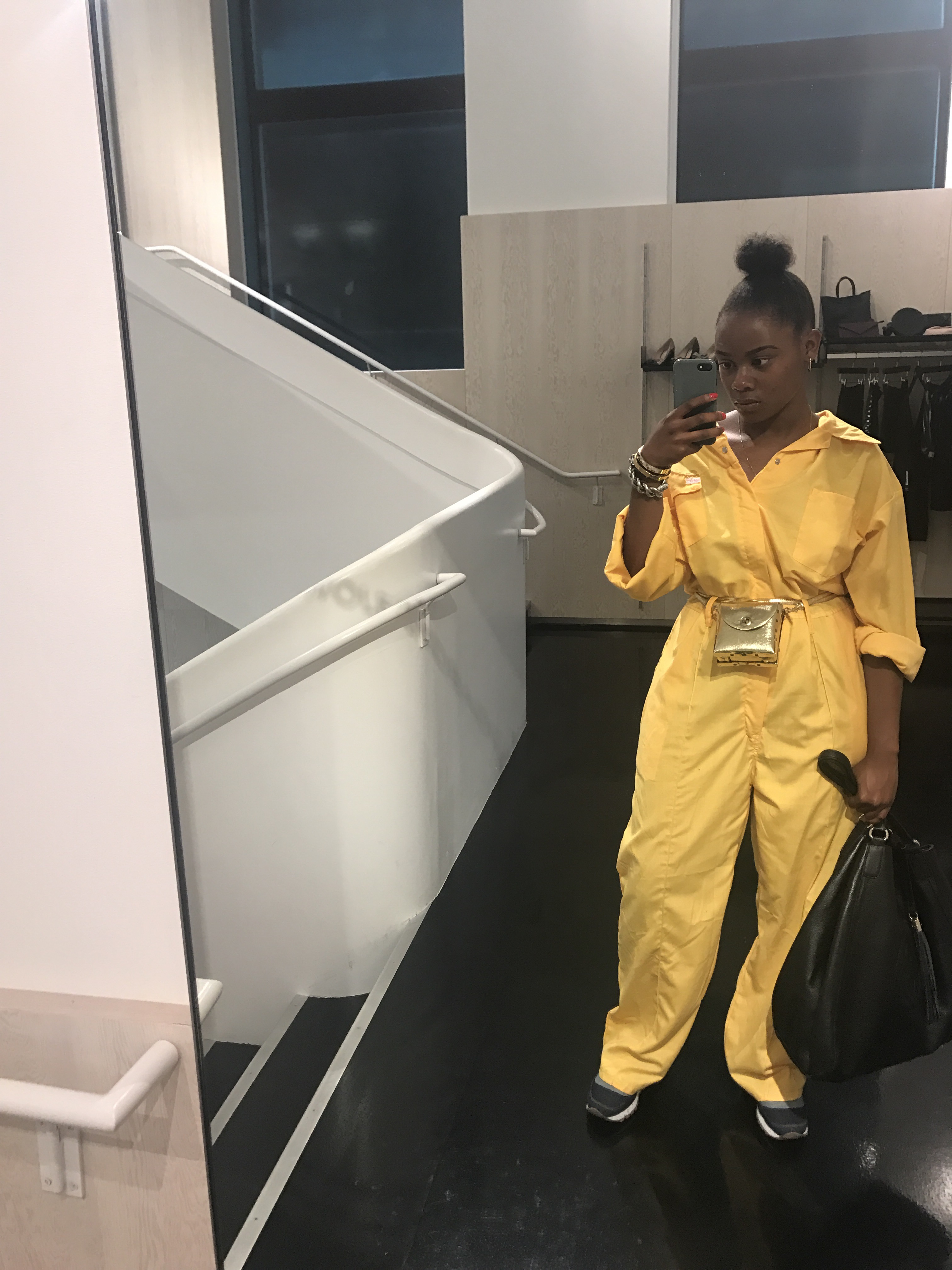 Today I styled a YELLOW construction jumpsuit. This “belt” was originally a tiny purse, but I thought it would work better around my waste.