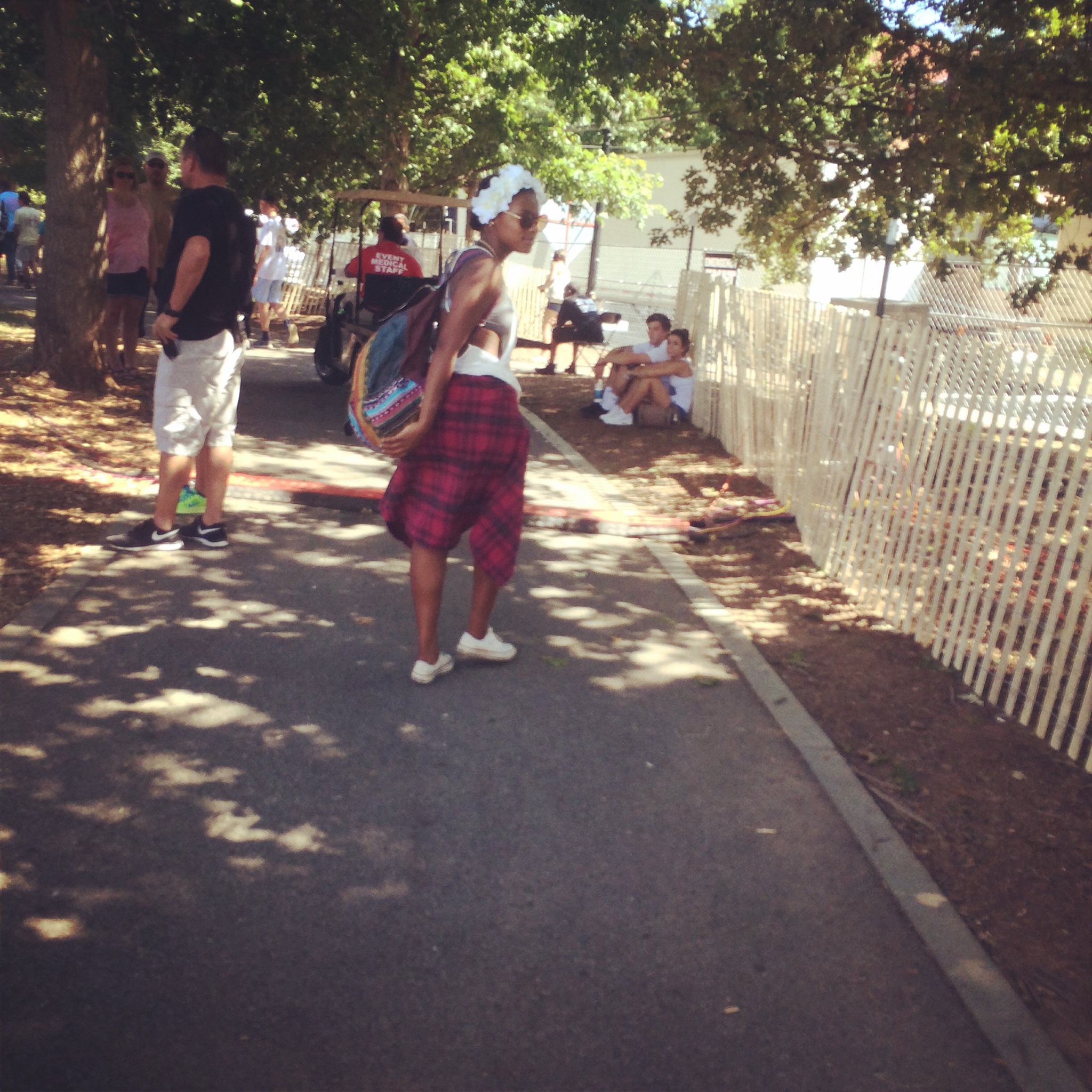 I wore a white tank that was very strappy and thin a grey bralette underneath. Black shorts. White converse because they are really comfortable and I was walking around a lot, but I think Doc Martens would look great with this too. An oversized flannel tied around my waist. And a DIY flower crown.