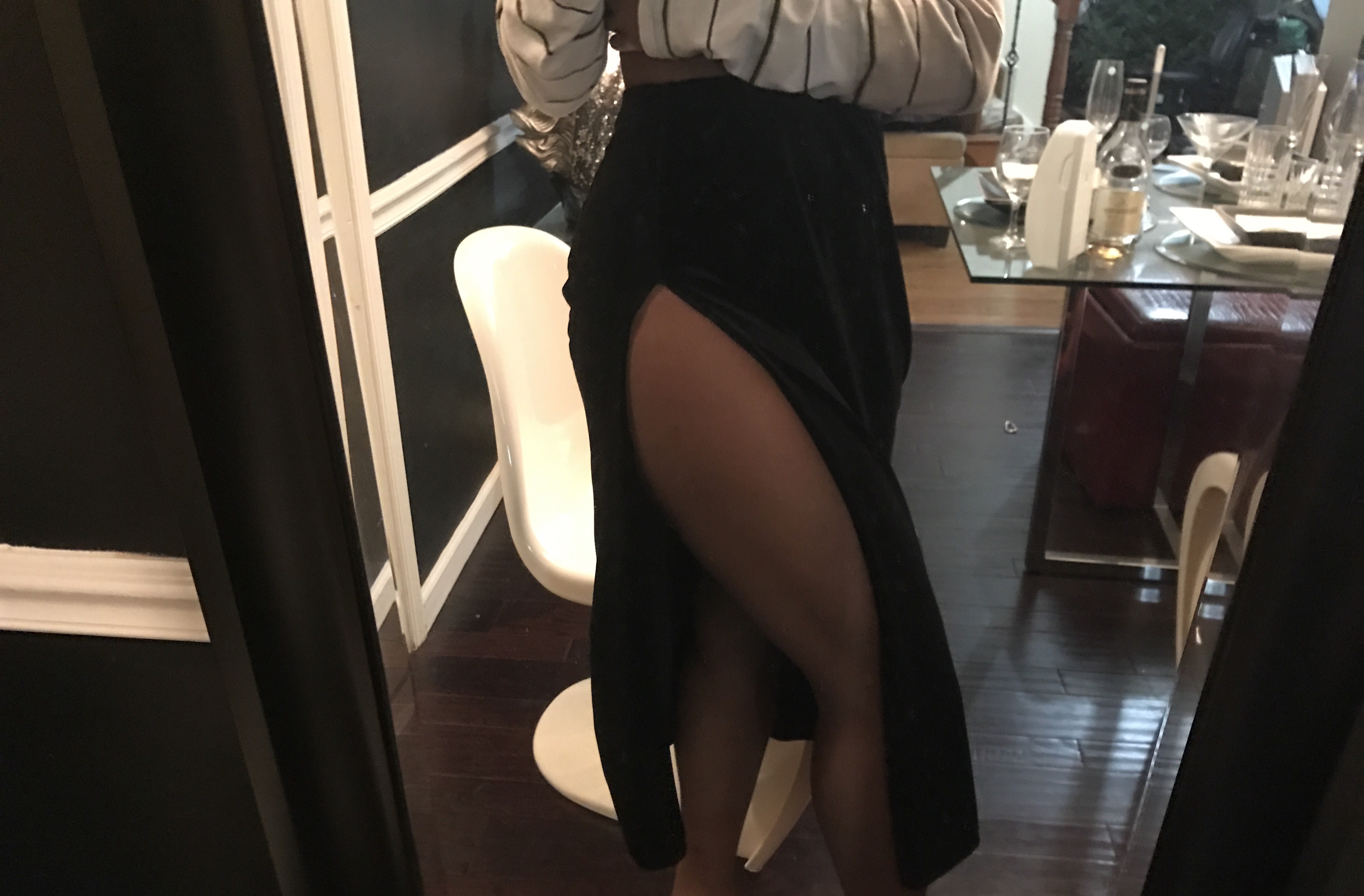 This piece hasn’t yet been styled, but it’s a black high slit skirt I created. A real 90s Mariah Carey moment.